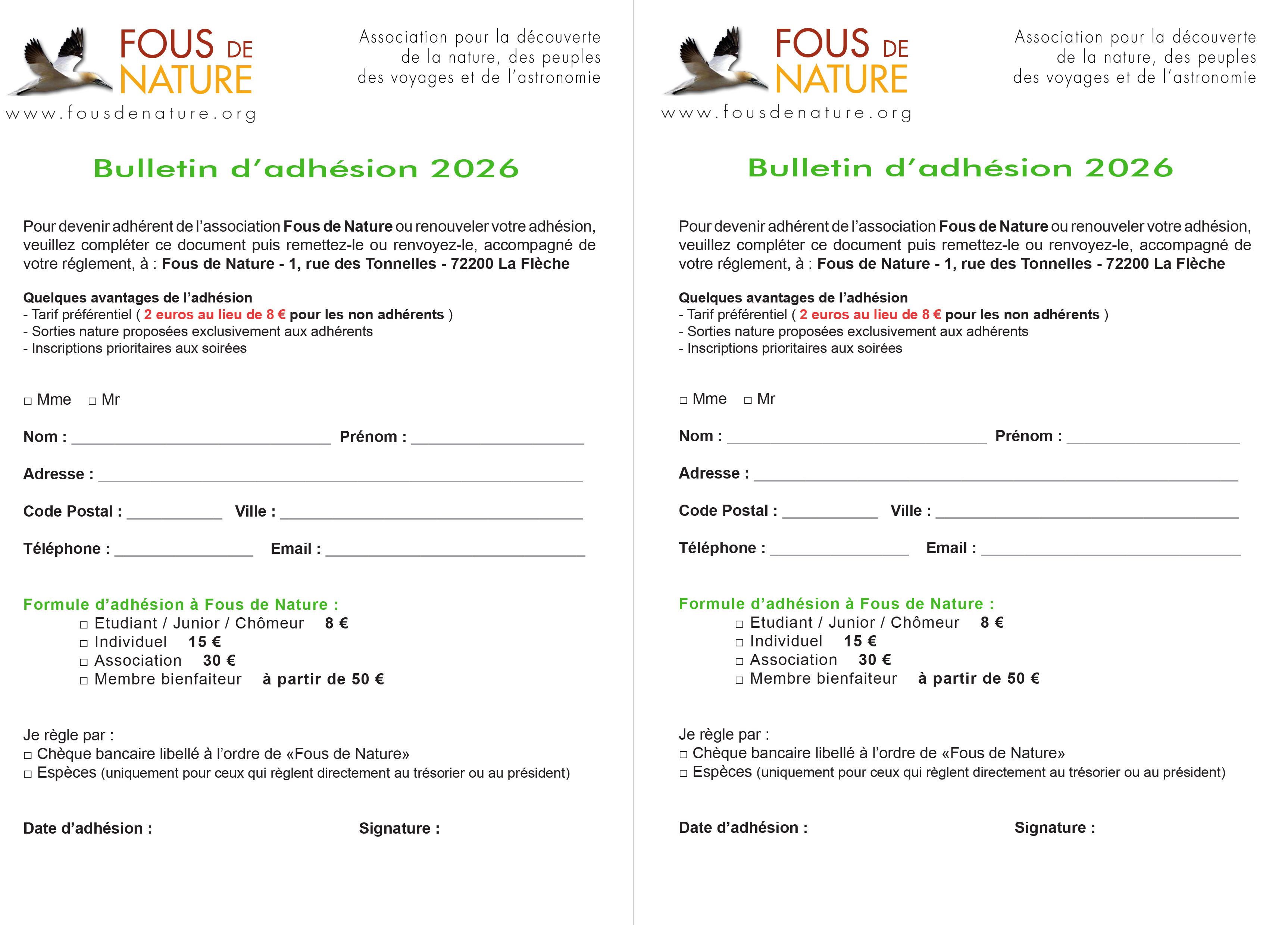 Vous pouvez adhérer à Fous de Nature pour profiter de tarifs préférentiels sur les entrées des évènements organisés par notre association (2 € au lieu de 8 €) mais aussi être prioritaire lors du lancement des réservations. Votre adhésion permettra de soutenir nos projets (soirées, expositions, découverte du ciel...).
