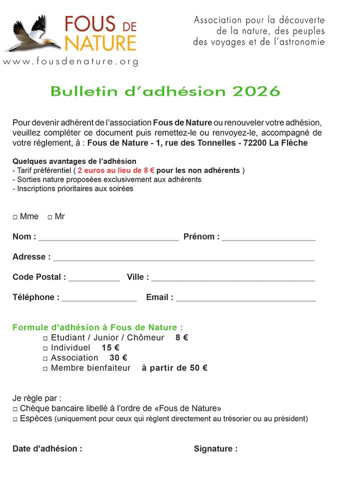 Vous pouvez adhérer à Fous de Nature pour profiter de tarifs préférentiels sur les entrées des évènements organisés par notre association (2 € au lieu de 8 €) mais aussi être prioritaire lors du lancement des réservations. Votre adhésion permettra de soutenir nos projets (soirées, expositions, découverte du ciel...).
